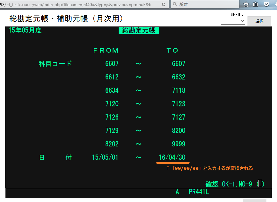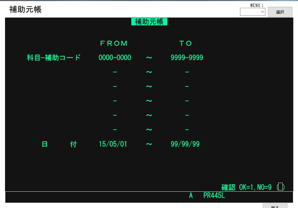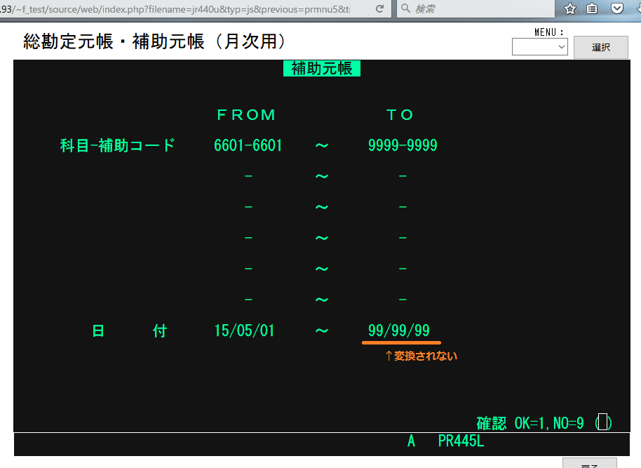 | 現象 | ・(総勘定元帳)Enter*3_99_99_99_1_ (補助元帳)Enter*2_ 画面左上に表示されていた「15年06月度」が消える |