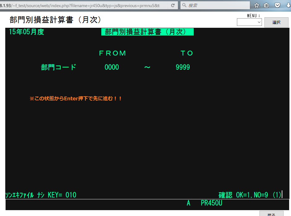 | 現象 | ・0_9999_1_ 「ソンエキファイル ナシ KEY= 010」でSTOPがかかり、Enter押下で先に進む。23行目の左下のカーソルに1を入力後、「カモク マスタ ナシ KEY= 7777 0000」。帳票が出力されない。 |