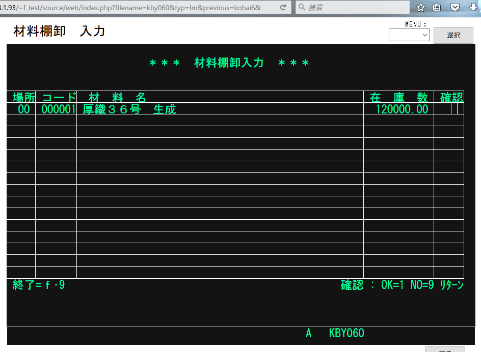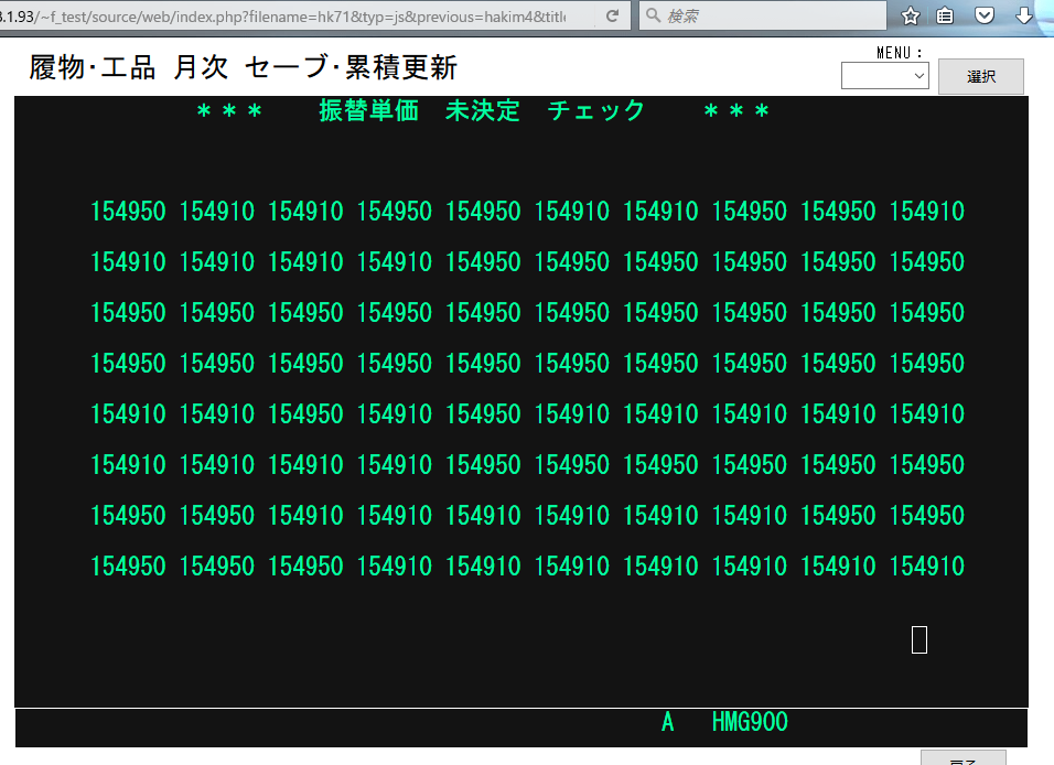 | 現象 | ・5_Enter_ コード欄でEnter押下時、コードに”9626″が表示され、一覧にそのデータも表示される。なぜ”9626″?仕様? (→”0000″を入力して1度メニューまで戻り、問合せ画面でEnter押すと、”9626″ではなく”0000″が表示される。以前のデータが残っているのかと思い、また別のコードで試すが”0000″が出る。最初の”9626″は?) (→最初に帳票出力をしてから問合せでEnter押すと、”9626″になる。帳票に出力された最後の値が入っている) |