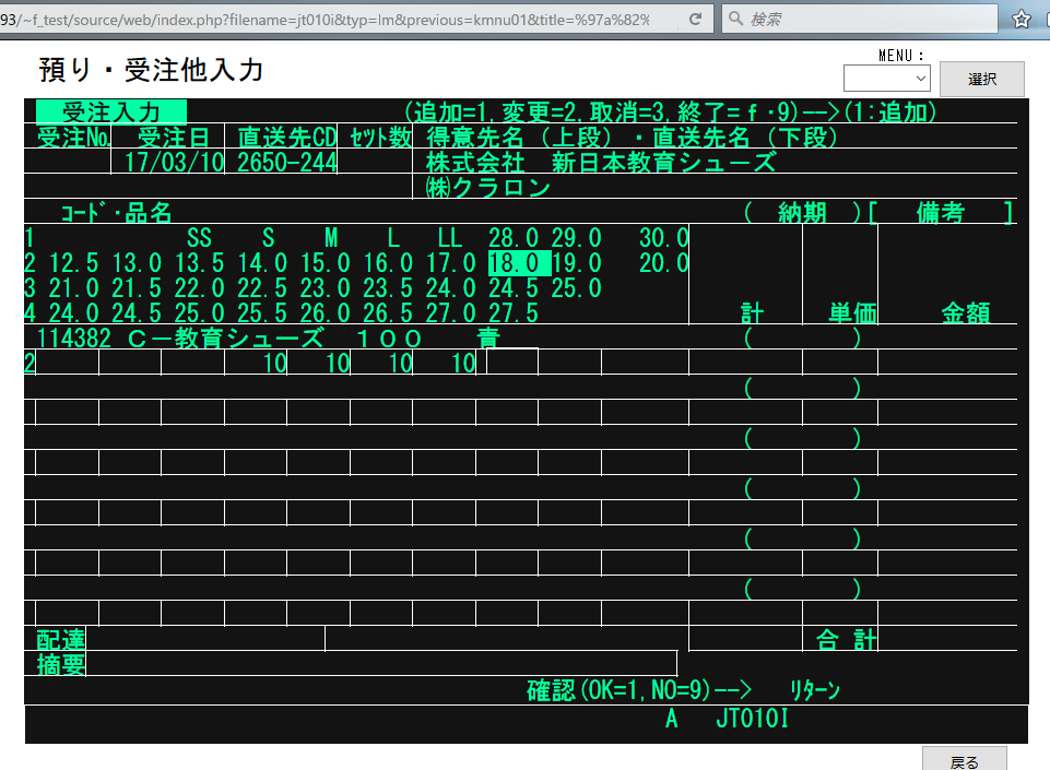0590)同じ値がズラズラ入力される メニュー名 KMNU01 番号 1 PG名 JT010I 現象 ・0_0_1_ 1(追加)_[Enter]*3_2650_244_[Enter]_114382_2_10_ [Tab]を入力すると10がズラズラ入力される 備考 発見日 2017/3/10 修正日 2017/10/2
