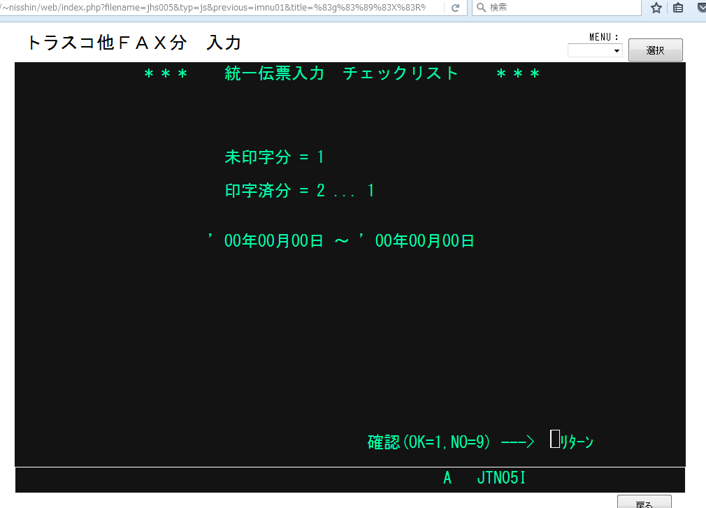 0600)”Tab”で飛ばしていくと”00年00月00日に変わる メニュー名 IMNU01 番号 31 PG名 jhs005.sh(JTN05I) 現象 入力終了後のチェックリスト入力(抽出入力)で、何日迄の所が99年99月99日と表示されているが”Tab”で飛ばしていくと”00年00月00日に変わる(別紙170315-2) 備考 ※(1611より)No.56 発見日 2017/3/15 小竹 修正日 2017/9/29