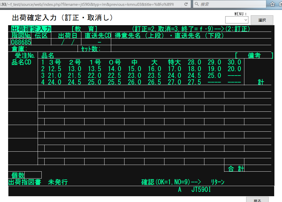 | 現象 | ・1_[Enter]_[Enter]_[Enter]_[Enter]_[Enter]_[Enter]_2650_244_ [Enter]_114110_ 入力した品名コードが全部の品名コード欄に表示される その後の数量や売価単価も。 次の行の品名コードで[F10]を押すと全て消える |