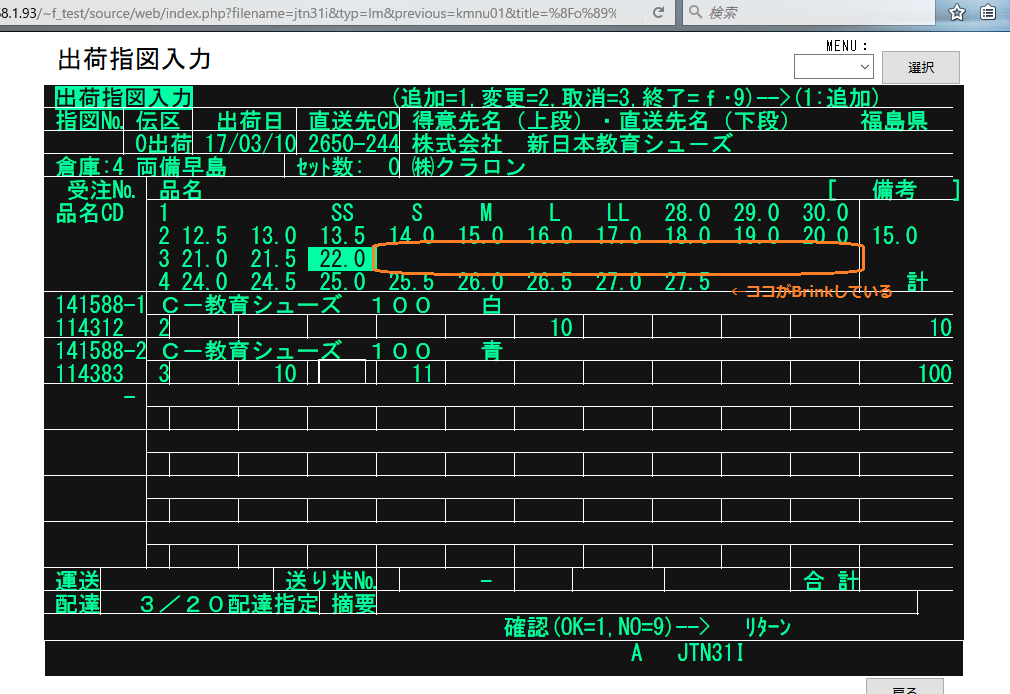 得意先コードに赤ちゃん本舗の”0077″が表示されるべきが、入力した品名コードが表示された上に”0077″が上書きされた状態で表示されている